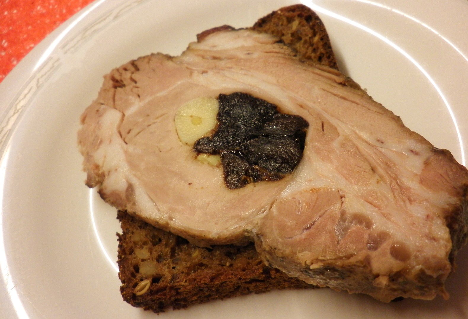 Kuidagi ilma planeerimata saabus jõulutoidu hooaja avamine. Tegelikult oleme hapukapsast (õlles hautatud, loomulikult ;) ) ja verivorsti juba söönud, aga see oli kogemata ja kiirustades, nii et ei lähe avalöögina arvesse. Ega eilegi polnud mul plaanis seapraega peret toita, aga hommikul külmakapi inventuuri tehes, selgus, et ega seal suurt midagi pole, peale 2 kilose seakaelakarbonaadi tüki, mille mu armas pr.ema mulle just saatis (ta nimelt on Saaremaa Lihatööstuse payroll'is, nii et Saaremaa toodangu headuses kahtlejatel on õigus kahleda mu objektiivsuses).